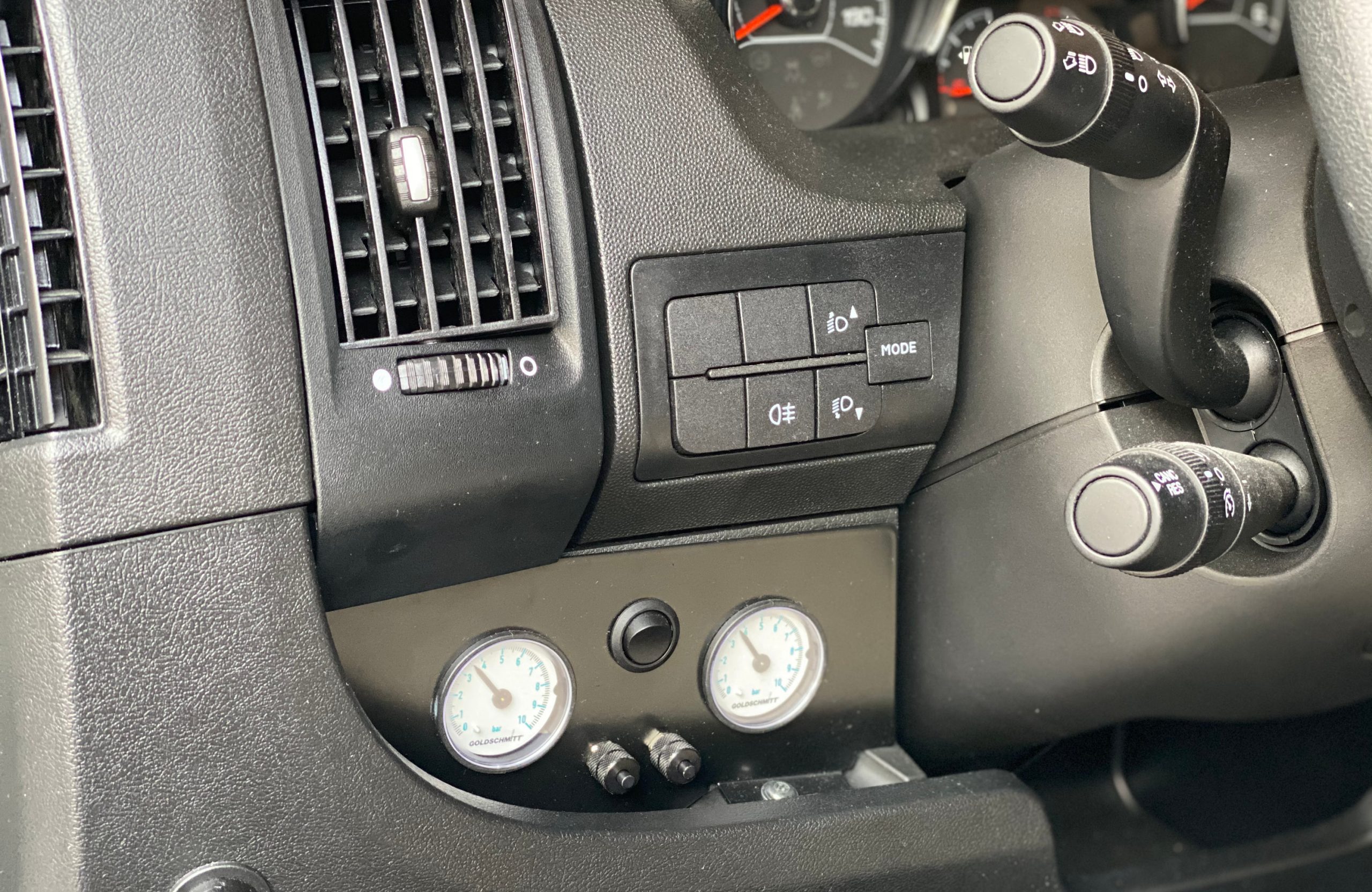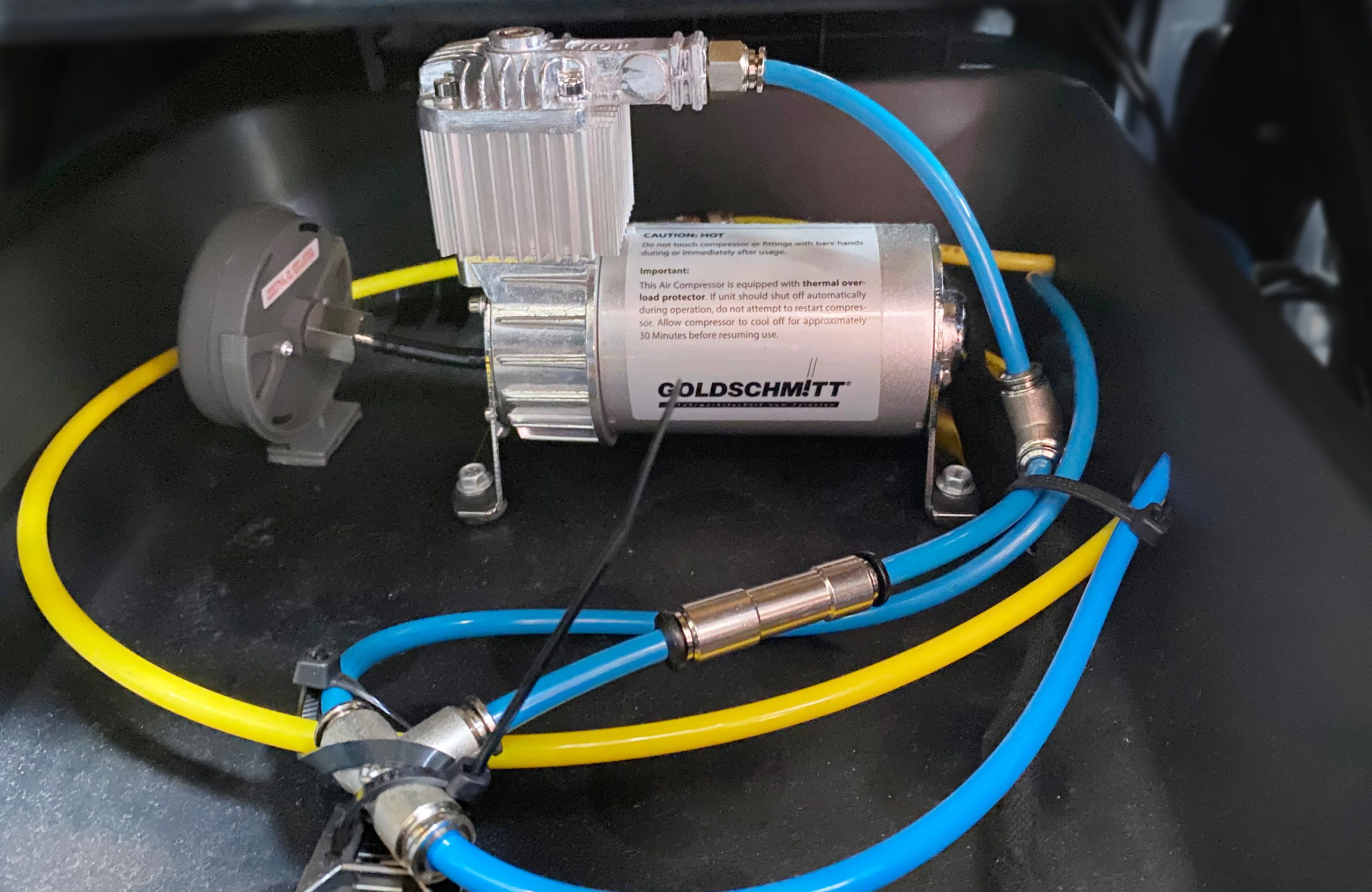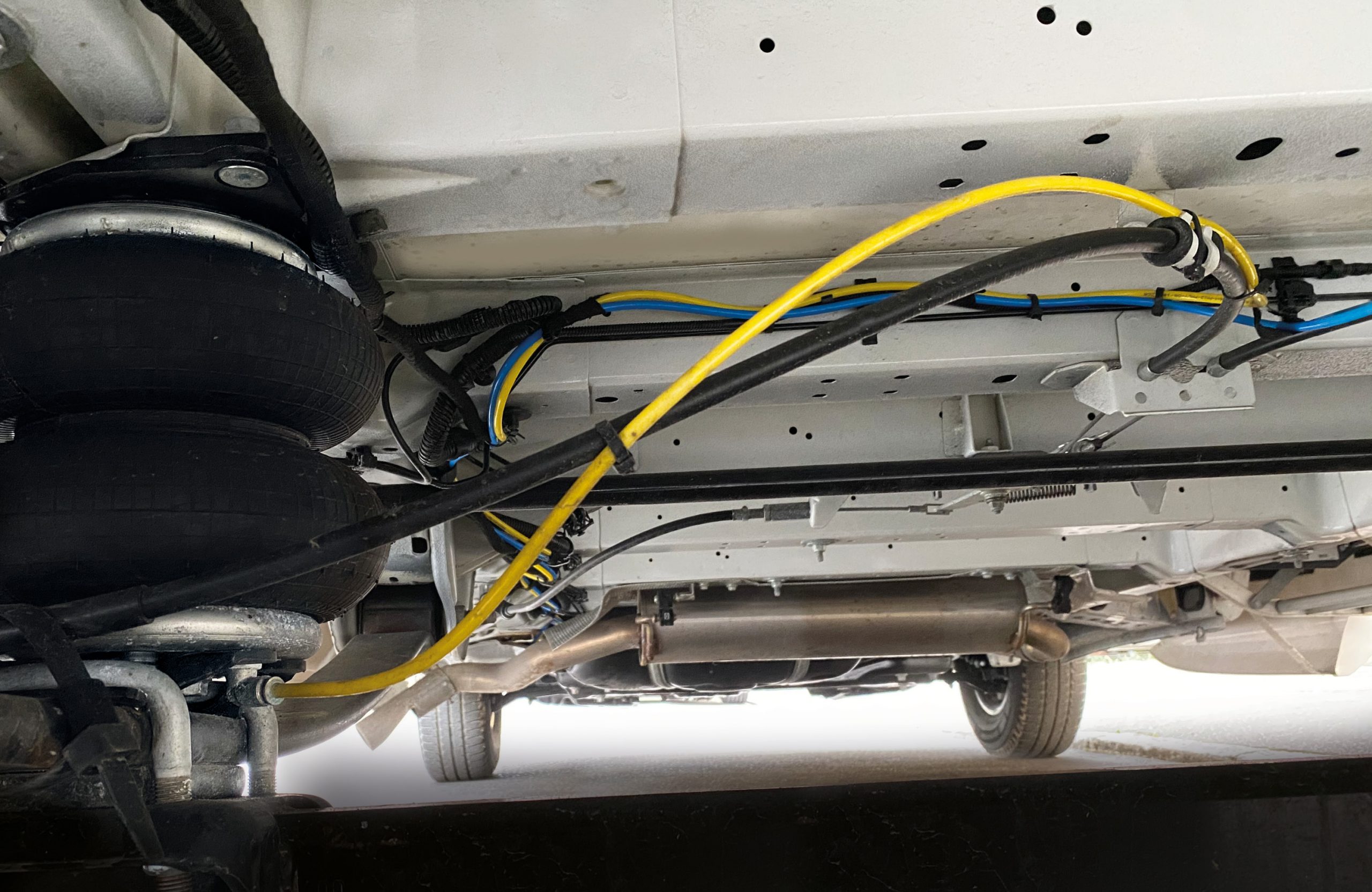 In diese Wohnmobil Fiat Ducato Chassis wurde ein Luftfahrwerk nachgerüstet. Durch dieses Luftfahrwerk ist eine Auflastung des Gewichtes von 3,5 t auf 3,8 t möglich. Das Luftfahrwerk ist über ein Bedienteil in der Höhe steuerbar. Die Pumpe für die Höhensteuerung wurde bei diesem Fahrzeug unter dem Fahrersitz positioniert. Von dieser Pumpe gehen die Druckleitungen zu den Luftbalken an den Achsen.
